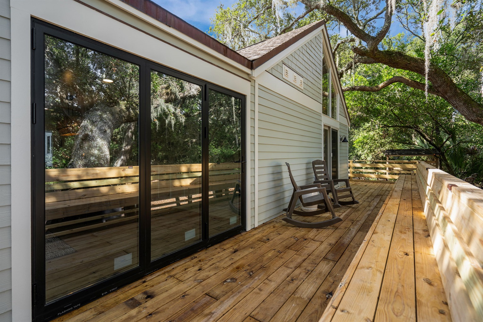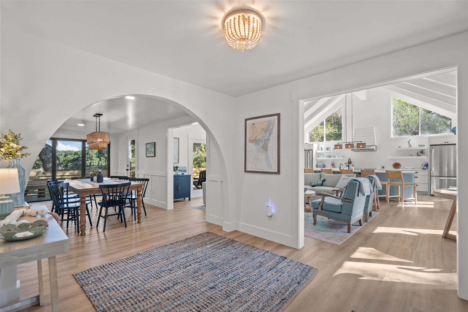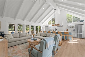 Inside, discover an open and inviting living space and kitchen equipped with two full-size refrigerators, a large island with seating for 6, a farmhouse sink, two large pantries, and a separate bar area complete with a wine fridge. The bright and airy dining room, with seating for 8, features a unique accordion door that opens onto a spacious deck with ample perimeter bench seating—perfect for relaxing and entertaining.