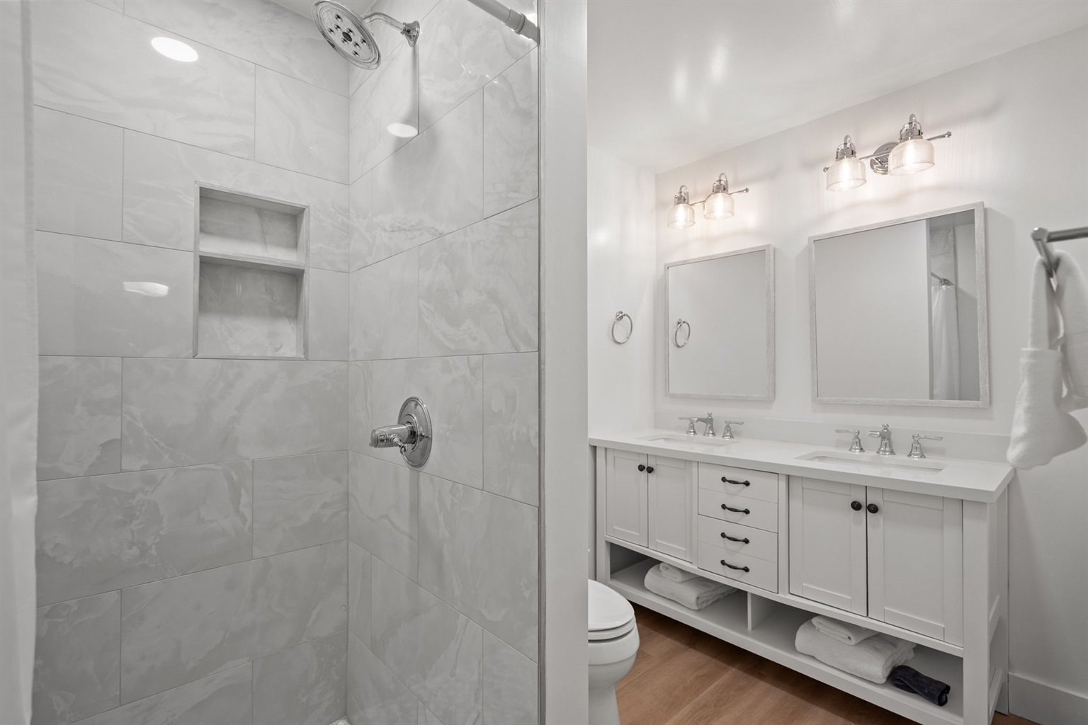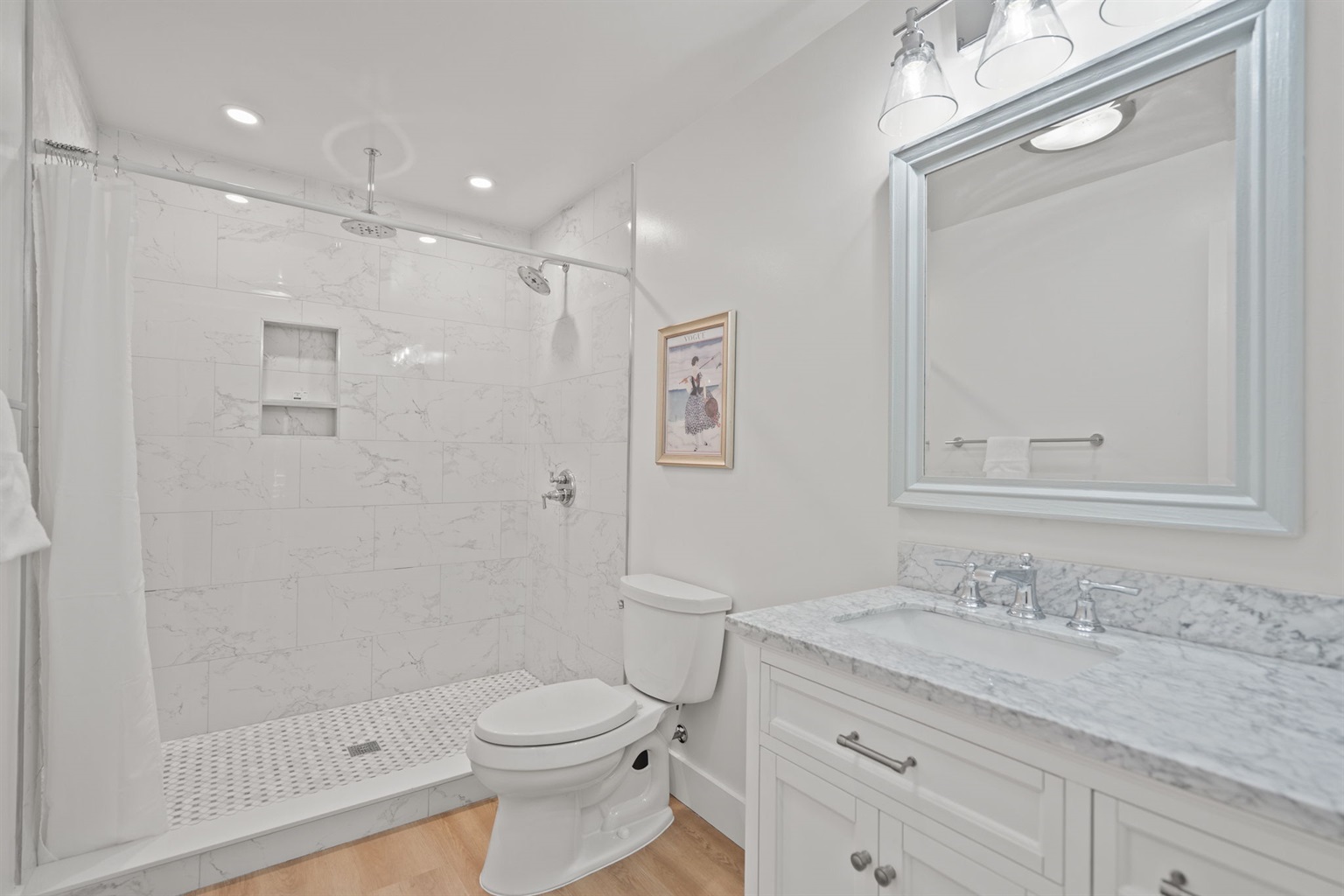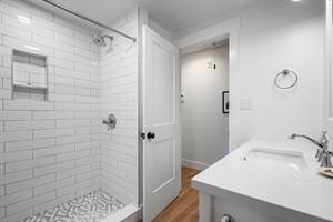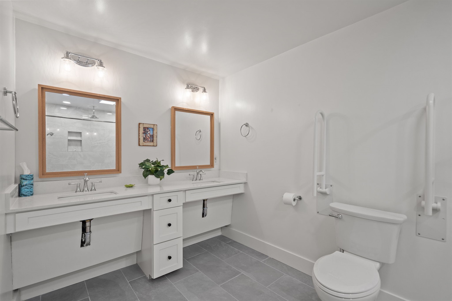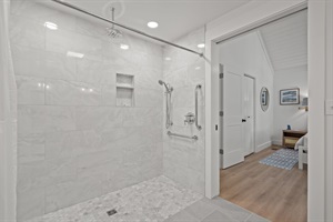 The bedrooms are generously sized, including multiple king suites with private ensuites, a fun and functional bunkroom with its own bathroom, and a king bedroom with a dedicated office area complete with a monitor and printer—ideal for remote work. The primary bathroom is fully wheelchair accessible, boasting a zero-entry shower with built-in bench, grab bars, a roll-under vanity, and an accessible toilet with support on both sides. Each bedroom has a dedicated bathroom, with four of the five offering ensuite privacy, plus an additional powder room for guests.